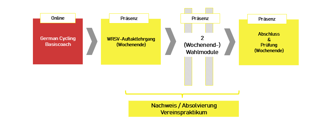 - Wie ist der Ablauf der BasisCoach Ausbildung bei German Cycling: Die Anmeldung zum BasisCoach erfolgt durch dich als Teilnehmenden eigenständig bei German Cycling: BasisCoach - German Cycling Trainer Club. Die Gebühren für den Basis Coach fallen separat an und sind entsprechend den Bedingungen von German Cycling direkt an diese zu entrichten. Gegenwärtig ist der Basis Coach für alle Teilnehmende unserer Ausbildungsreihen zum rabattierten Preis von 95 € buchbar.