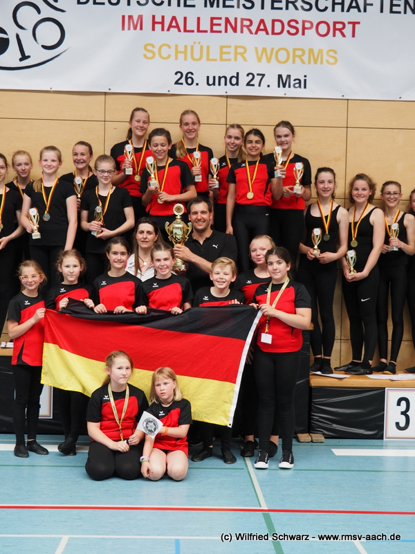 In den Mannschafts-Disziplinen im 4er und 6er Kunst- und Einrad dominierte 2018 der RMSV Aach mit seinen Mannschaften, denn nur in einer Disziplin gab es keine Medaille für die Hegauer. Im 4er Einrad Schüler offen ging der DM-Titel an Aach 1 mit Yannik Gaißer, Rebecca Grote, Celina Kanz und Janina Setzer und Bronze an Aach2 mit Jone Burow, Lena Andorhina, Lilien Hengefeld und Anika Meßmer. Die Mannschaft des RV Klengen mit Florian Käfer, Julia Obergfell, Sarah Obergfell und Hella Mandik schloss sich auf Rang 4 an. Bei den Schülerinnen im 4er Einrad ging der Titel an Oberesslingen und die Mannschaften aus Aach (Nathalie Grote, Hannah Elsässer, Leonie Willmann und Julia Matt) und Varnhalt (Anne Strohmeier, Lena Doll, Kathi Haeberle, Mara Haeberle) holten Silber und Bronze. Im 6er Einrad Schüler offen gab es durch die Aacher Mannschaften einen Doppelsieg, Mannschaft 1 mit Lilien Hengefeld, Nathalie Grote, Hannah Elsässer, Janina Setzer, Julia Matt und Leonie Willmann gewann Gold und Mannschaft 2 mit Yannik Gaißer, Jone Burow, Lena Andorhina, Anika Meßmer, Rebecca Grote und Angelie Willmann Silber. Die Mannschaften aus Friedrichshafen und Oberesslingen kamen auf die Plätze 5 und 6. Im 6er Kunstrad Schüler offen holte die aacher Mannschaft mit Yannik Gaißer, Lena Andorhina, Nathalie Grote, Hannah Elsässer, Julia Matt und Janina Setzer ebenfalls Gold. Platz 3 ging an den RV Ebnat und der die zweite Mannschaft aus Aach mit Jone Burow, Lilien Hengefeld, Rebecca Grote,Leonie Willmann, Celina Kanz und Ilenia Savino fuhr auf Rang 8. Die einzige Disziplin in der es für Baden-Württemberg keine Medaille gab war das 4er Kunstrad Schülerinnen, der KRS Varnhalt belegte hier als beste Mannschaft in der Besetzung Lena Doll, Kathi Haeberle, Mara Haeberle und Anne Strohmeier Platz 6. Das Quartett aus Aach mit Janina Setzer, Leonie Willmann, Celina Kanz und Ilenia Savino erreichte Platz 11 und auf Rang 15 folgte noch die Mannschaft aus Ilsfeld. In der offenen Klasse im 4er Kunstrad gab es nochmals einen Doppelsieg für den RMSV Aach, mit einer sehr starken Leistung gewannen Yannik Gaißer, Nathalie Grote, Julia Matt und Hannah Elsässer den DM-Titel. Vize-Meister wurden Jone Burow, Lena Andorhina, Lilien Hengefeld und Rebecca Grote. Die Mannschaft aus Denkendorf erreichte Platz 5.