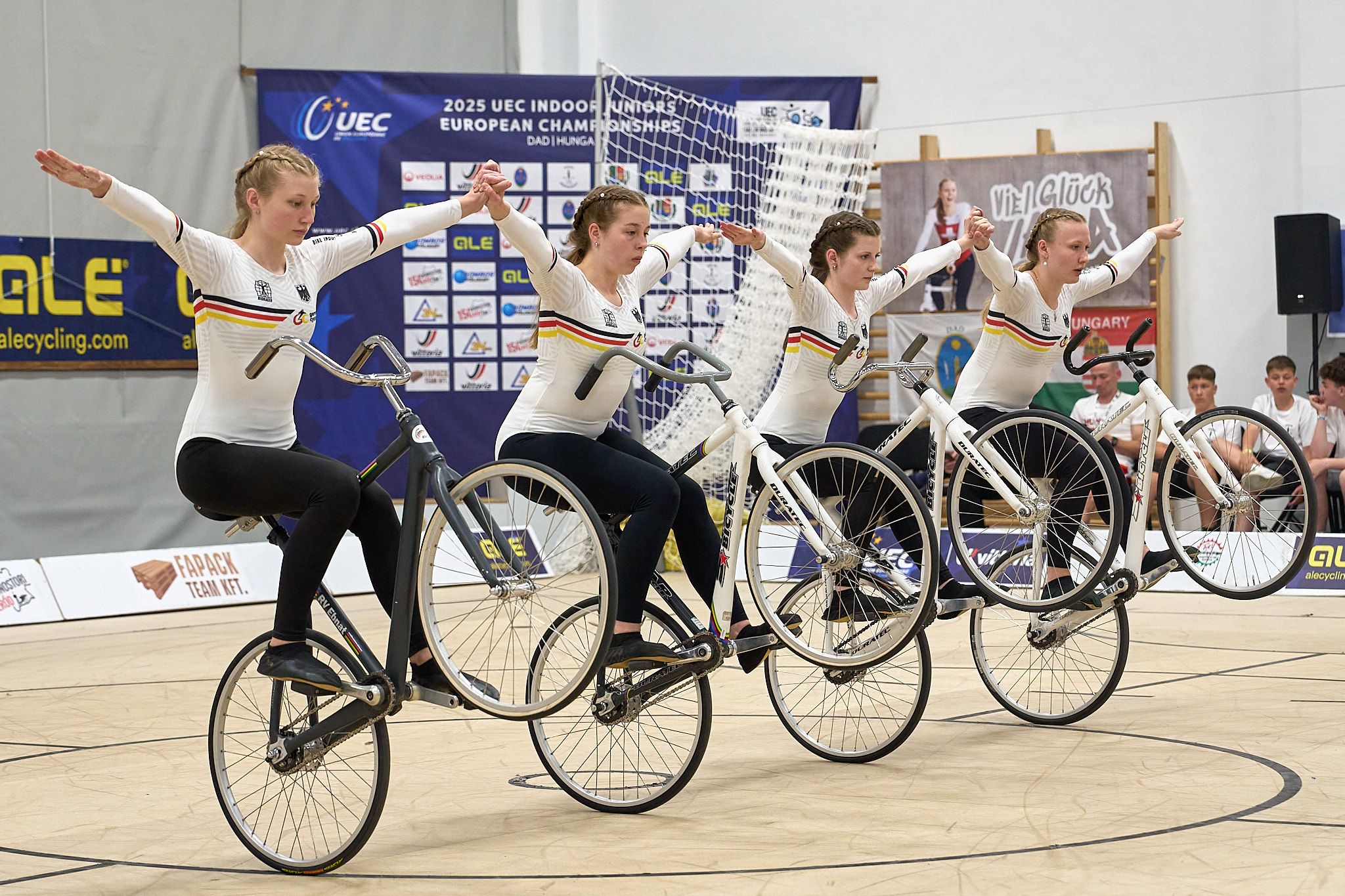 Auch im 4er Kunstradsport ging Gold an Deutschland: Jessica Haag, Lea Mühlberger, Peggy Kienle, Katja Preston (RV Ebnat, WTB) gewannen hier knapp gegen das Schweizer Team.